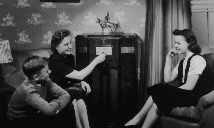 People gather around a large valve radio in 1940. By that point, over 80% of American households owned a radio.
