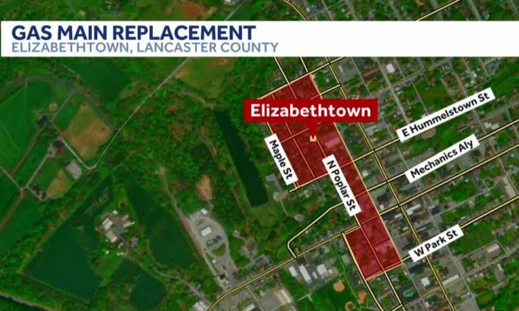 UGI crews are installing a new natural gas main pipe in Elizabethtown, Lancaster County.Schedule, work areaConstruction is taking place Monday through Friday from 7 a.m. to 5 p.m. in the area shaded in red (see map below). The work is scheduled to continue until the end of March. UGI says there may be some lane and parking restrictions, as well as some interruptions to gas service in the area.